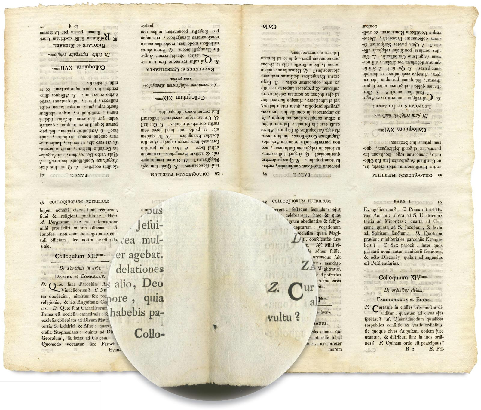Printed books don’t have the same kinds of layout marks that manuscripts do, but the process of printing, especially during the period in which printing was done by hand, can also leave its traces in the form of holes. One of the more interesting pieces of evidence left by the operation of the handpress is the presence of “point holes.” These holes, which are often mistaken for the numerous holes that were made when the book was sewn for binding, occur in different places in books of various formats (e.g., folio, quarto, octavo, duodecimo). They’re hard to find, though, because they’ve usually been trimmed off or made invisible by the binding of the book. “Points” were the sharp metal projections used to pierce a sheet of paper and hold it in place on the tympan of a printing press, and the points needed to be placed carefully (and asymmetrically) to make it obvious to a pressman if a sheet were turned the wrong way around when it was put back on the press to print its other side. Point holes can be identified by their asymmetrical placement, and they’re most often visible in untrimmed books that are unbound, or which have been disbound. They tend to be much more visible in incunabula than in later books, and though they can be difficult to find, they’re interesting to look for, and they remain unknown to most collectors.