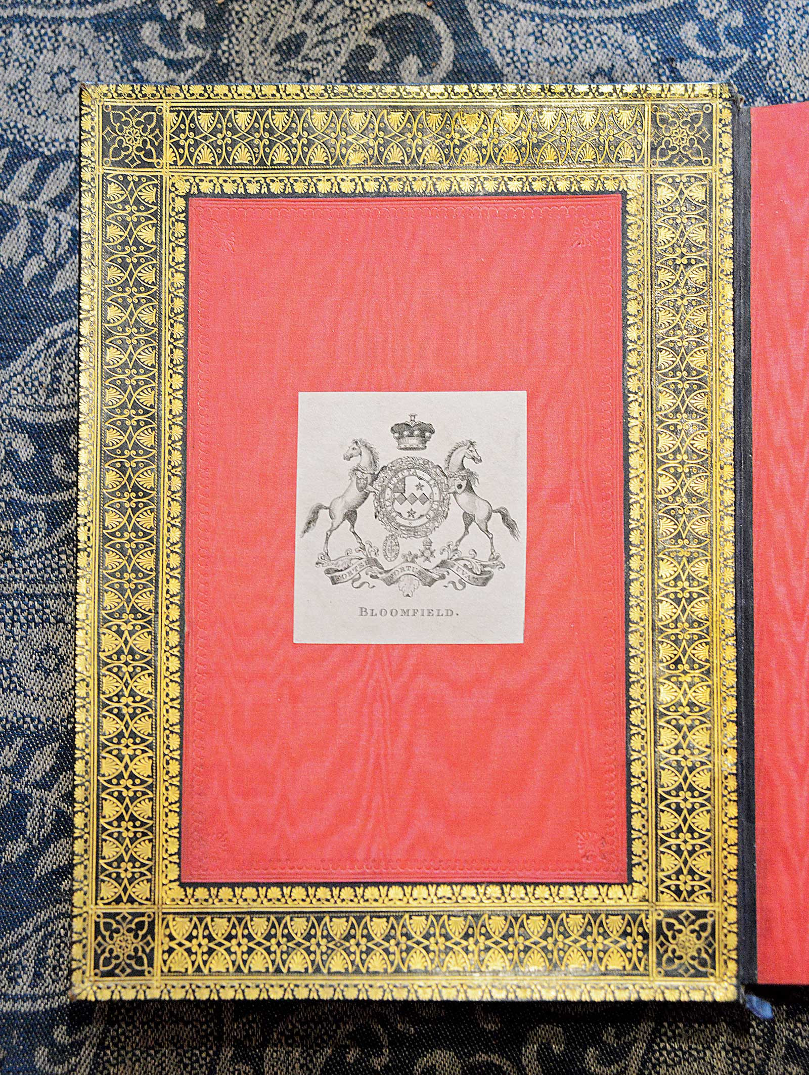 One day he came across a truly astonishing volume: a Calcutta imprint from 1794 in mint condition, bound in a lustrous indigo-blue Indian goatskin binding, with gilt roll tooling around the covers and the entirety of the flat spine consisting of repeated fish and flowers. It was stunning and clearly contemporary with the book’s printing. “I dubbed this unknown binding maestro the ‘Moghul Fish’ binder, as his fish reminded me of the royal insignia used by the rulers of Oude. Years later I found other books bound by the Moghul Fish binder in the same style and books with copies of his distinctive roll tool used on Indian bindings in a more European style.”