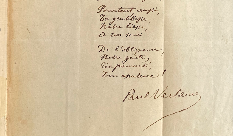 Verlaine, Dedicaces. 1894. New edition, but from a limited edition of just 55 copies + manuscript poem. Estimate: $7,000-10,000