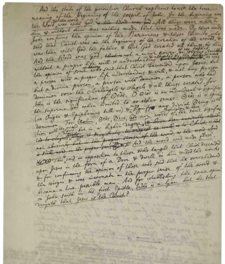 Working at the highest level of metaphysics, and looking to the Gospel of John, the manuscript sees Newton contemplate the Divine Word at the core of Creation, inquiring both into its pre-existence and into its immanence ("incarnation"). Newton begins by analyzing the views of Christ held by the earliest Christian sects (based on Epiphanius's Against Heresies, 4th-century) and seeks to connect them to the Kabbalistic doctrines of the Sephirot and of the Adam Kadmon ("Transcendent Man"). Affirming in the concluding paragraph that "this state of the primitive Church explains to us the true meaning of the beginning of the gospel of John," Newton proceeds to articulate his understanding of "In the beginning was the Word..." – explicitly asserting his definition of God.