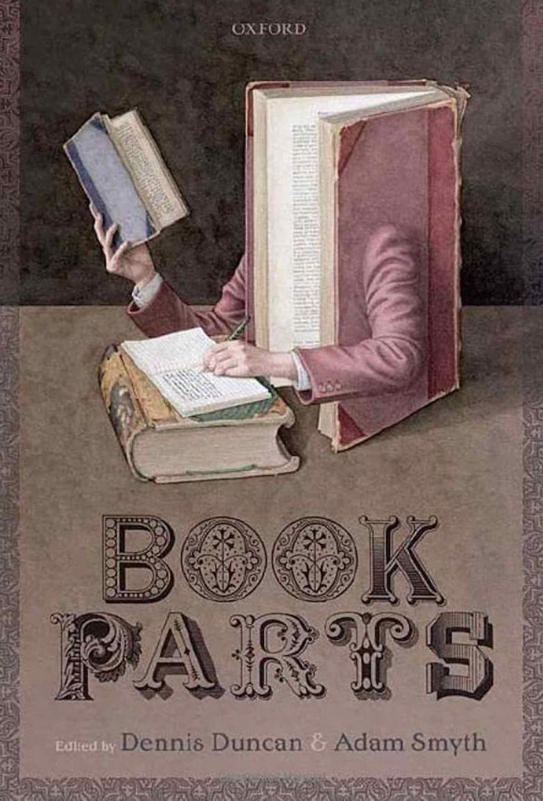 Edited by Dennis Duncan (author most recently of Index: A Bookish Adventure from Medieval Manuscripts to the Digital Age) and Adam Smyth (Professor of English Literature and the History of the Book at Balliol College, Oxford), Book Parts examines the various key components of books in short chapters, starting with Introductions, Dust Jackets, and Frontispieces, and moving through Chapter Heads, Epigraphs, and Running Titles, ending up with Indexes, Errata Lists, and Blurbs. These are lined up in the order in which they normally appear which is a nice touch, although the reader can easily dip in and out at will without loss.