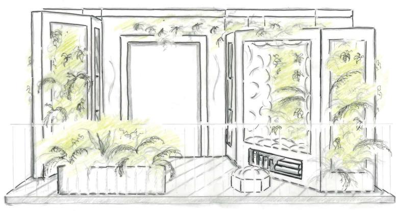 Designed by Gini Denison-Pender of Beautiful Wild, it takes the form of a small garden with a window seat and a selection of books curated by Ultimate Library on translucent glass shelves within a light timber structure and set in a calm spot among ferns and plants reminiscent of temperate and tropical rainforests. The garden window seat will be repurposed after the Show and live on at the Max Roach Centre in Brixton.