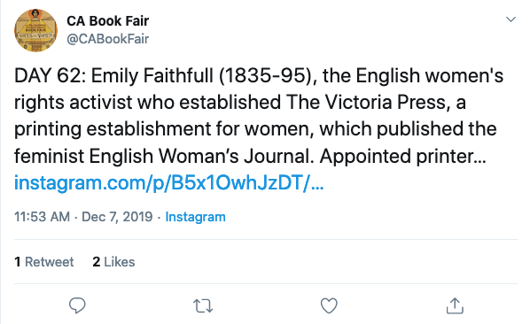 In the run-up to the Californian Antiquarian Book Fair in Pasadena in February, an innovative social media campaign celebrating the 100th anniversary of women’s suffrage has been launched. Since its debut on October 30 with nineteenth-century activist Lucretia Mott, the CA Book Fair has been posting brief, daily profiles of women who made history (#herstory) to its Twitter, Facebook, and Instagram pages. Among those highlighted so far: Octavia Butler, Simone de Beauvoir, Charlotte Perkins Gilman, Susan Sontag, Rachel Carson, Margaret Fuller, Audre Lorde, and Margaret Atwood. (We’re showing our literary bias here; they’ve also featured Marie Curie, Abigail Adams, Amelia Earhart, and many more.)