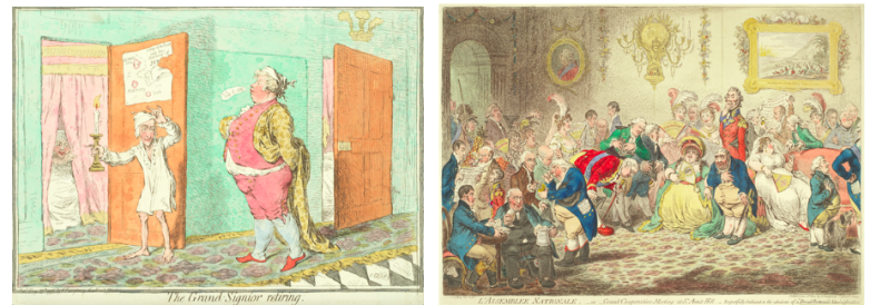 The number of works that Gillray produced at this time reflected the mood of the British public. Capitalising on the upper-class’s demand and curiosity for engaging content, the etchings would be posted daily on the shopfront window of Gillray’s publisher-printseller Hannah Humphrey’s print shop. The hand-coloured etchings allowed an alternative form of political criticism to the current conservative newspaper format.