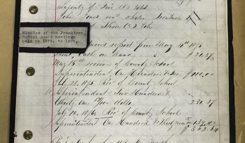 The CYCL scrapbook contains handwritten minutes of Franktown School Board meetings from as early as 1875.