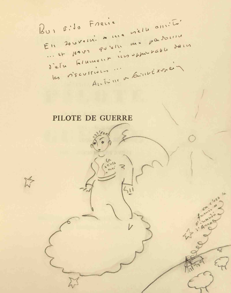 The lot also includes another drawing of Saint-Exupéry smoking a cigarette by the story's illustrator Bernard Lamotte on the blank facing page, and two related letters from Saint-Exupéry in early 1942 to the couple, one of which features another pen and ink self-portrait which again recalls The Little Prince.