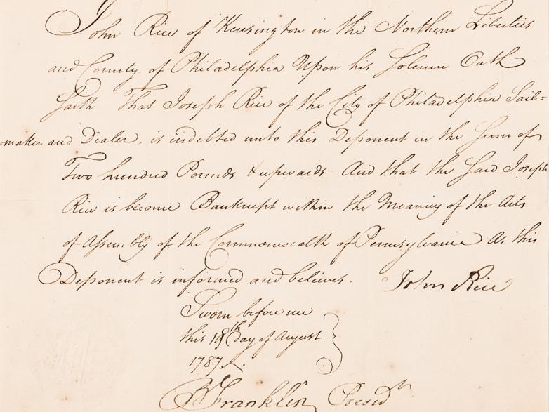 A 1787 sworn oath testifying to a debt owed by a Philadelphia sailmaker signed by Benjamin Franklin brought $10,000.