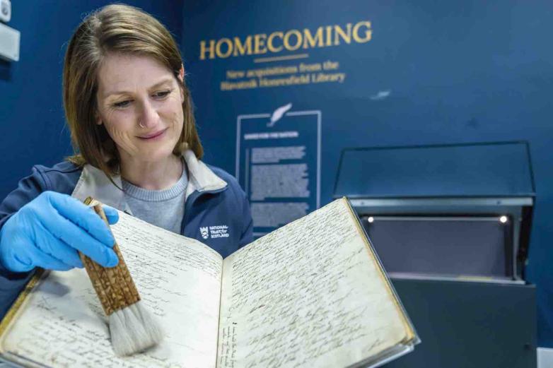 Suzanne Reid, Regional Conservator for the National Trust for Scotland inspects the First Commonplace Book