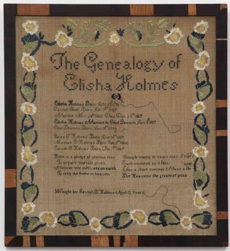 Worked in long, short, cross- and double cross-stitch on a linen ground, the sampler is titled The Genealogy of Elisha Holmes and assumes the form of an abbreviated family tree. As documented in the embroidery, Holmes was born on December 17, 1817, in Provincetown, Barnstable, Massachusetts, to Saviah Cook and Elisha Bartlett Holmes. She was 12 years old when she made the sampler, on March 24, 1838.