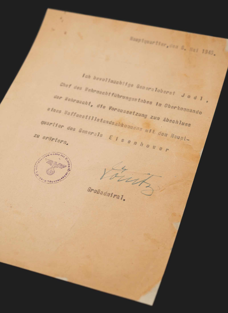 Dated May 6, 1945, the one-page directive empowered Colonel General Alfred Jodl to "discuss the conditions for concluding an armistice agreement with General Eisenhower's headquarters", marking the first official act in Germany's unconditional surrender. With Adolf Hitler dead by suicide just days earlier, Dönitz, his appointed successor, issued this order as the Third Reich collapsed under the weight of Allied and Soviet advances.