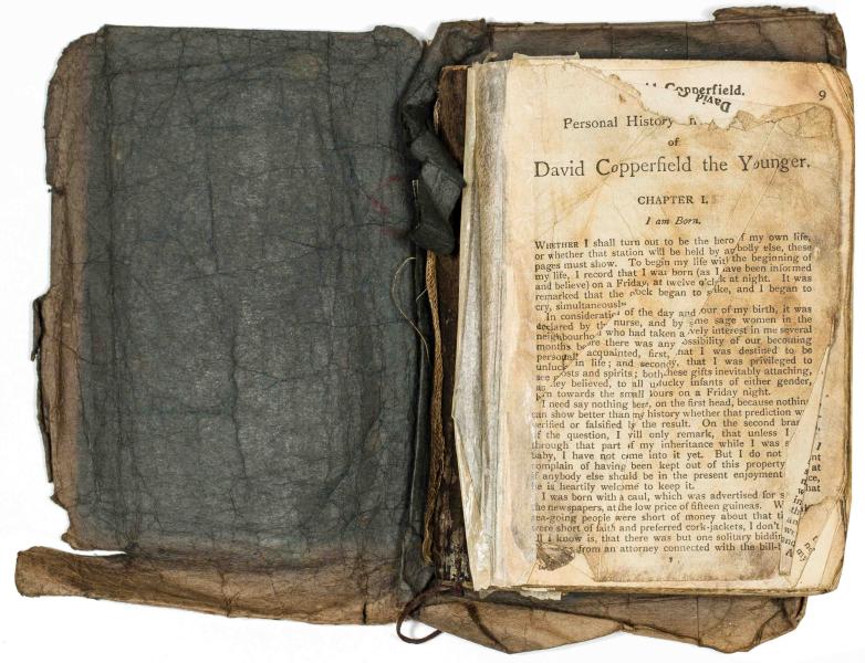 Star of the show is a 1910 edition of David Copperfield which was part of the impressively stocked library taken by Captain Robert Falcon Scott and his men on the Terra Nova expedition to Antarctica in 1912. Several of the men, trapped in an ice cave for more than half a year, read a chapter of it aloud each night for two months. Among them was geologist Raymond Priestley who said that when they had finished the book, they were “very sorry to part with him.” Considering all that it’s been through, and some blubber-stains apart, this small volume is in remarkably decent condition.