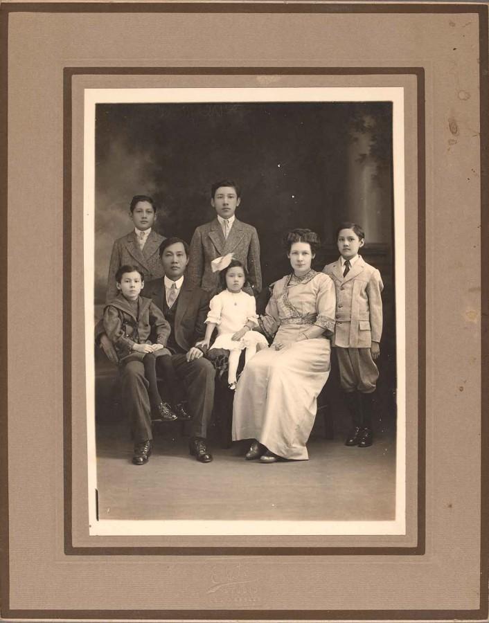 Portrait of the See Family, including Fong See (second from left) and Letticie "Ticie" Pruett (second from right) and their five children, 1914. Unknown photographer.