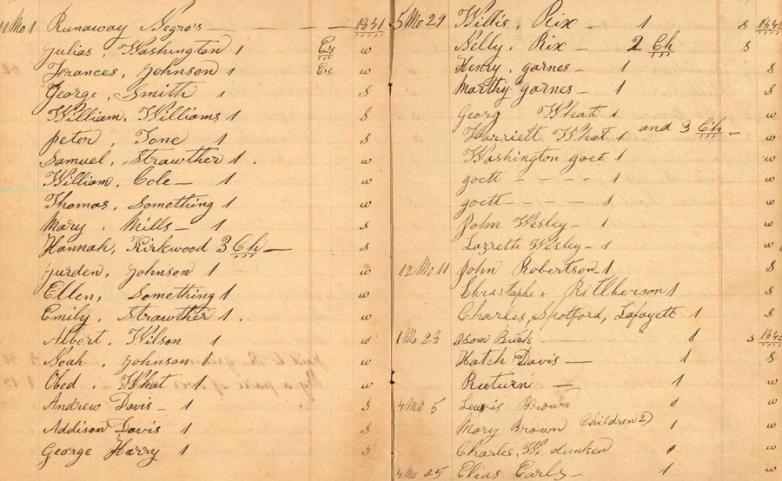 The journal lists 137 individuals who were escaping slavery, some with such evocative names as "North Star" or "General W. Hampton," and some denoted only by first name. Some entries include the number of children in the group, sometimes as many as five. Each entry is marked with either "S" or "W," markings that may have indicated a next stop on their northward journey.
