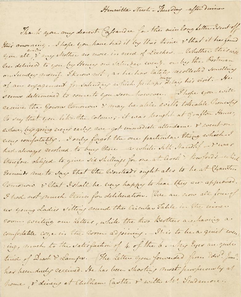 The auctioneer points out another neat fact about this particular piece of correspondence, namely Austen's use of the word “coze,” predating the word’s first recorded appearance (in her own novel, Mansfield Park, the following year). Austen writes, "We are now all four of us young Ladies sitting round the Circular Table in the inner room writing our Letters, while the two Brothers are having a comfortable coze in the room adjoining...."