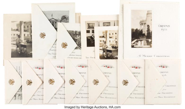 * Harry S. Truman: V-E Day Proclamation Signed as President and Inscribed to White House Chief of Staff John Steelman on Christmas Day: To commemorate the end of the war in Europe, this multicolored lithograph printed May 8, 1945, proclaims "Sunday, May 13, 1945, to be a day of prayer." With a lengthy inscription and large signature in the lower left margin, the president, whose birthday was May 8, has written, "This was a happy birthday for me. I hope this will be a happy Christmas for you. To Hon. John R. Steelman and Mrs. Steelman. 12/25/45." Steelman served as the first assistant to the president of the United States (a position today known as the White House chief of staff) from 1946 through 1953. Franklin D. Roosevelt: 13 White House Christmas Cards: This collection of 13 White House Christmas cards, many in their original transmittal envelopes, hail from 1933 to 1945. As Mary notes, even though there had been presidential Christmas greetings in the past, including these cards from Roosevelt's administration, the sending of a White House Christmas card only became an official tradition during the Eisenhower administration. "[The tradition] was never interrupted when there was a world war, when there was an assassination of a president or 9/11 or anything," she says. "It was always there and on time."