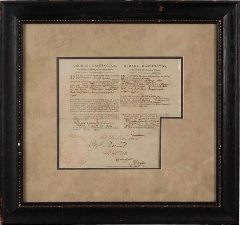 The exceedingly rare sea letter signed by Washington (as President) and Jefferson (as Secretary of State) is a four-language cut ship document, dated July 9, 1793, and signed three times by Hodijah Baylies, the collector of customs, for the schooner Rebecca, to the ship’s commander, Samuel Swasey.