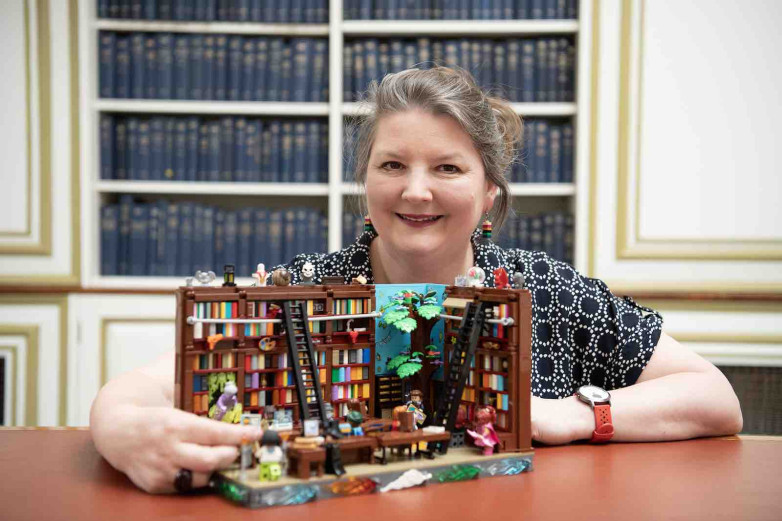 Teresa Elsmore with a lego library model which forms part of the National Library of Scotland's centenary exhibition Dear Library