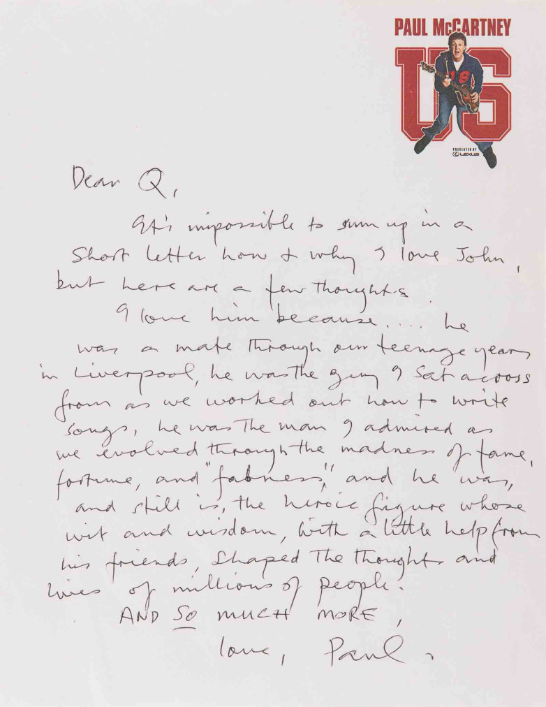 Leading the auction is a handwritten letter by McCartney on his custom 'Paul McCartney US' letterhead around 2005 to Q magazine, offering a reflection on John Lennon. Signed "love, Paul," the letter was discovered within the archives of Bauer Media following the publication's closure. "He was, and still is, the heroic figure whose wit and wisdom, with a little help from his friends, shaped the thoughts and lives of millions," writes McCartney. "It's impossible to sum up in a short letter how & why I love John…"