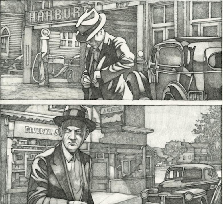 Hyman, as it turns out, is the grandson of writer Shirley Jackson, whose short story "The Lottery" appeared in the June 26, 1948 issue of the New Yorker and has quietly terrified readers ever since. In a bid to "affirm a tangible link to her life and work in a way that was both professional and deeply personal," Hyman's original charcoal drawings from his 2016 graphic novel adaptation of Jackson's story are also on display, as well as original pages from his graphic novel adaptation of The Black Dahlia by James Ellroy and The Prague Coupe by Jean-Luc Fromental.