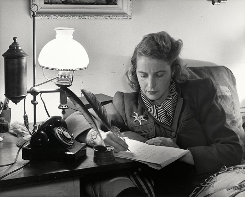 Most of the portraits are photographic, although a few are drawings and two are sculpted busts. In several cases, the photographer was or has become as prominent as the writer whom they captured. Willa Cather is pictured in a 1927 photo by Edward Steichen. Peter Hujar took the 1975 image of Susan Sontag. David Attie snapped the 1959 portrait of Lorraine Hansberry. And the 1961 photo of poet Anne Sexton in her “writing nook” was shot by Rollie McKenna, known for her portraits of mid-century writers and artists, especially Dylan Thomas and Sylvia Plath (who is, strangely, not among the women featured in Her Story, though the NPG does hold a gelatin silver print of her famous 1959 portrait).