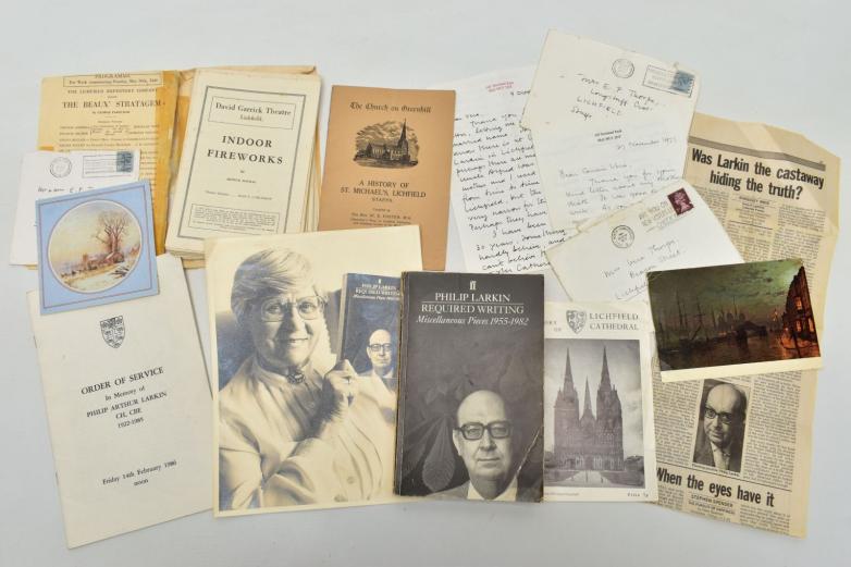In addition to the letters and cards, the lot includes a first edition of the book Required Writing – Miscellaneous Pieces 1955-1982 signed by another Larkin cousin, Edgar; a photograph of Mrs Thorpe holding said book; an order of service for Larkin’s memorial at Westminster Abbey on February 14, 1986; and a ticket stub from the Lichfield Festival’s celebration of Philip Larkin in July of that year. There are also 20 David Garrick Theatre programmes dated 1949-1952 and vintage guides to Lichfield Cathedral and the city’s St Michael’s Church.