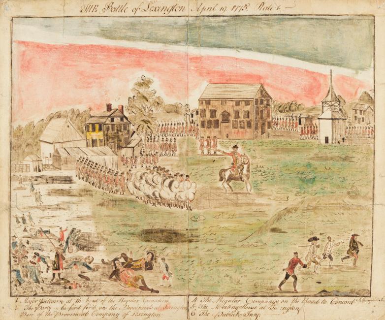 Watercolor of the Battle of Lexington by 14-year-old St. John Honeywood, offered at Swann Galleries this week.