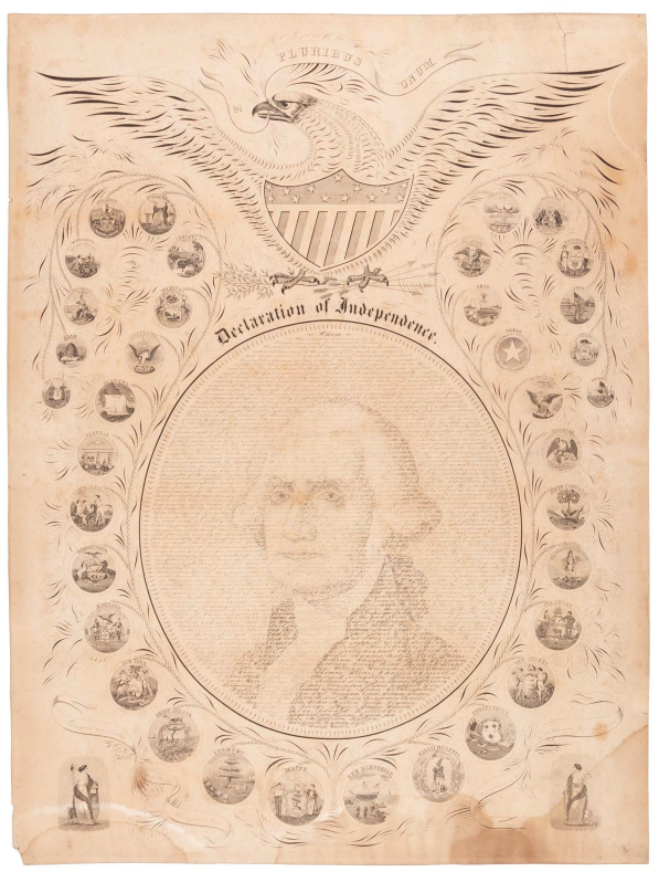 Lithographed Declaration of Independence, with the calligraphic text forming a portrait of George Washington. Offered at PBA Galleries on Thursday.