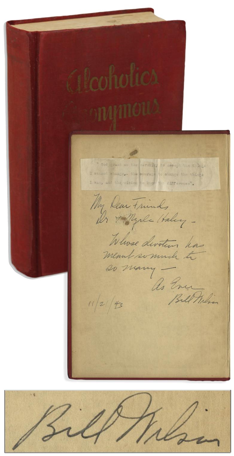 There are only 1,900 surviving first printings of Alcoholics Anonymous. Copies signed by Bill Wilson are extraordinarily rare. Wilson signed this copy on the front pastedown to his friends Dr. and Mrs. Forrist V. Haley, in full: ''My Dear Friends / Dr & Myrle Haley / Whose devotion has meant so much to so many - / As Ever / Bill Wilson / 11/21/43''. Bidding on the book begins at $19,500.