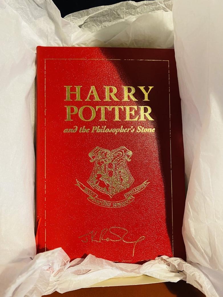 The leather-bound special 15th anniversary edition of Harry Potter and the Philosopher’s Stone, published exclusively for the competition and signed by author J K Rowling.