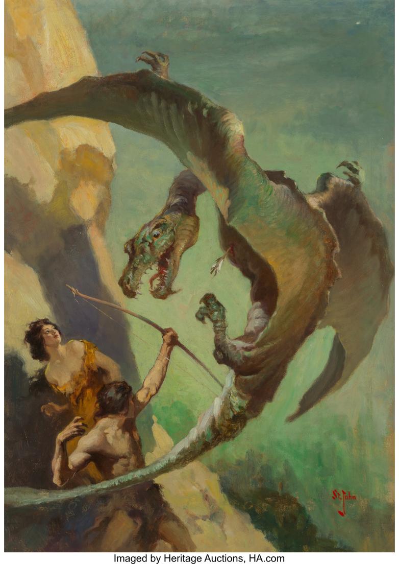 James Allen St. John At the Earth's Core book dust jacket, 1922 (estimate: $75,000+) is a spectacular image that was published on the hard cover dust jacket of the first edition of At the Earth’s Core by Edgar Rice Burroughs (A.C. McClurg & Co., 1922). St. John is widely recognized for his impact on the visual language of fantasy illustration, in part because of the image offered here. To land such an iconic image from such an important book by an artist considered one of the best ever at fantasy illustration presents a rare opportunity for serious collectors.