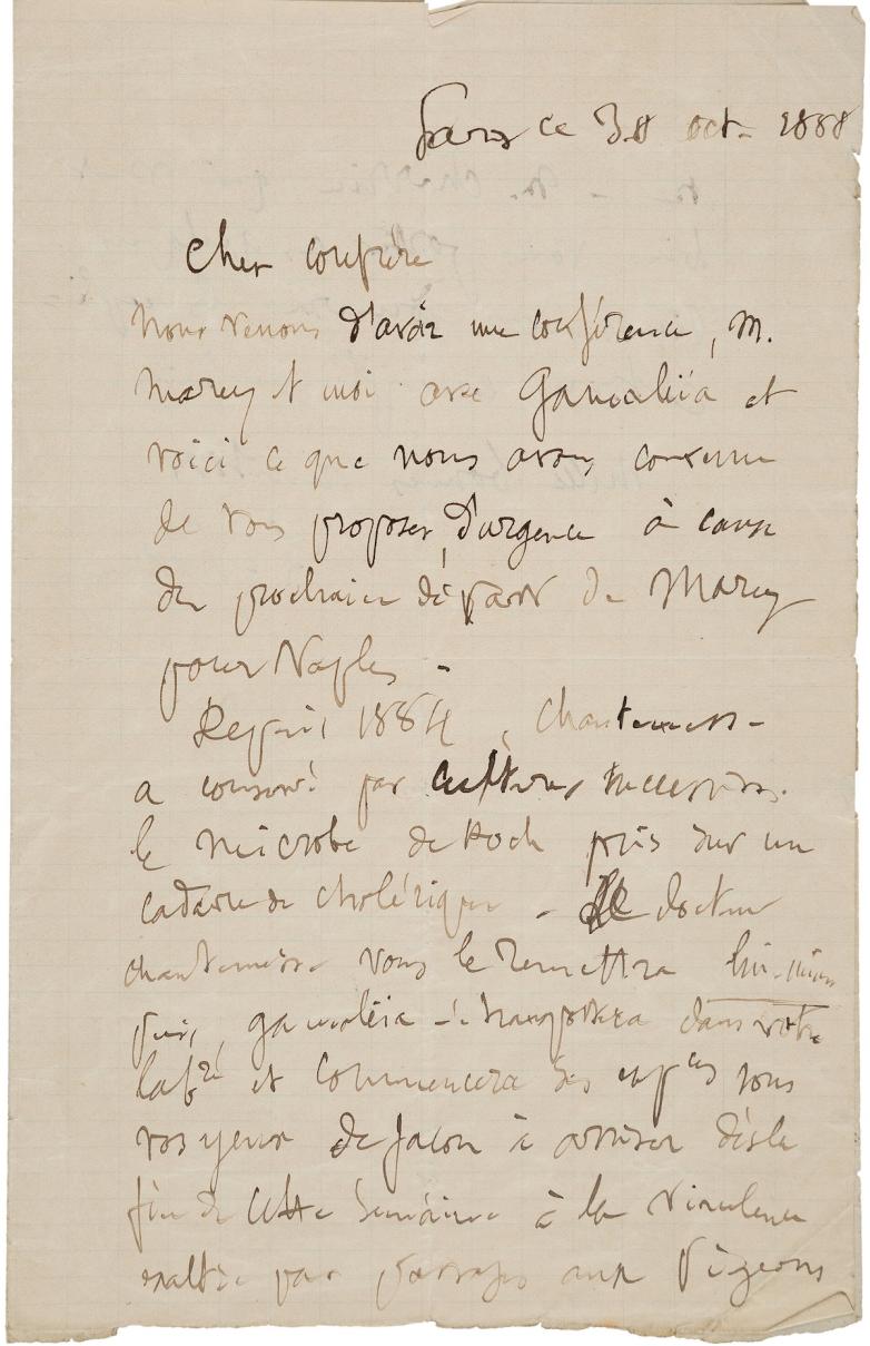 Louis Pasteur’s letter of Oct. 30, 1888 letter concerns cholera.