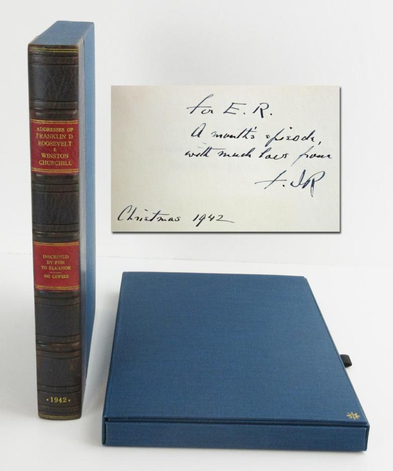 Presentation copy of Addresses of Franklin D. Roosevelt and Winston Churchill, a war dated book from 1942, signed and inscribed by FDR to Eleanor Roosevelt. Estimate: $20,000-24,000