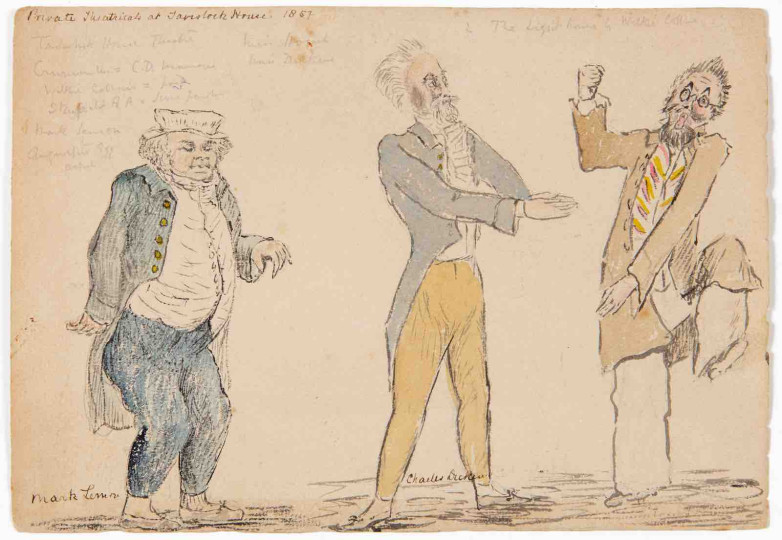 The informal, on-the-spot sketches were made in 1855 and 1857 by Nathaniel Powell, Dickens’s next door neighbour at his home at Tavistock Square, also in Bloomsbury, London. Also depicted are his friend Mark Lemon, editor of Punch magazine and his eldest daughter Mamie Dickens. His friend and fellow novelist Wilkie Collins also acted in the theatre company, having collaborated with Dickens to write The Frozen Deep.
