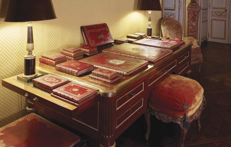 In April 2019, I was part of a small group of Morgan staff tasked with inventorying and packing up Wrightsman’s books from her apartment. There she had created Versailles on Fifth Avenue, with the only exception being that it looked out to Central Park rather than André Le Nôtre’s formal gardens. The grandeur of the setting was heightened through the display of books on the desks, tables, and bureaus that furnished each room. She lived with her collection in a way that most bibliophile collectors might not. The books were not relegated to shelves, with only their spines peeking out, or sequestered in protective boxes. Rather, they were seamlessly displayed as part of a material environment of art and objet, complete aesthetic immersion. Placed atop furniture or standing vertically, with front covers proudly facing out, the books were thus allowed to be appreciated for the material qualities of their embellished bindings—glints of gold on fields of red.