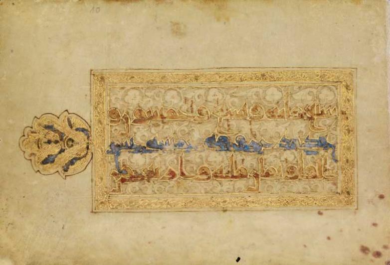 A carpet page from a ninth-century North African Qur'an, showing one of the earliest examples of chrysography, maker unknown. Pen and ink, gold paint, and tempera colors. Leaf: 14.4 x 20.8 cm (5-11/16 x 8-3/16 in.) 83.MM.118.2.10.recto.