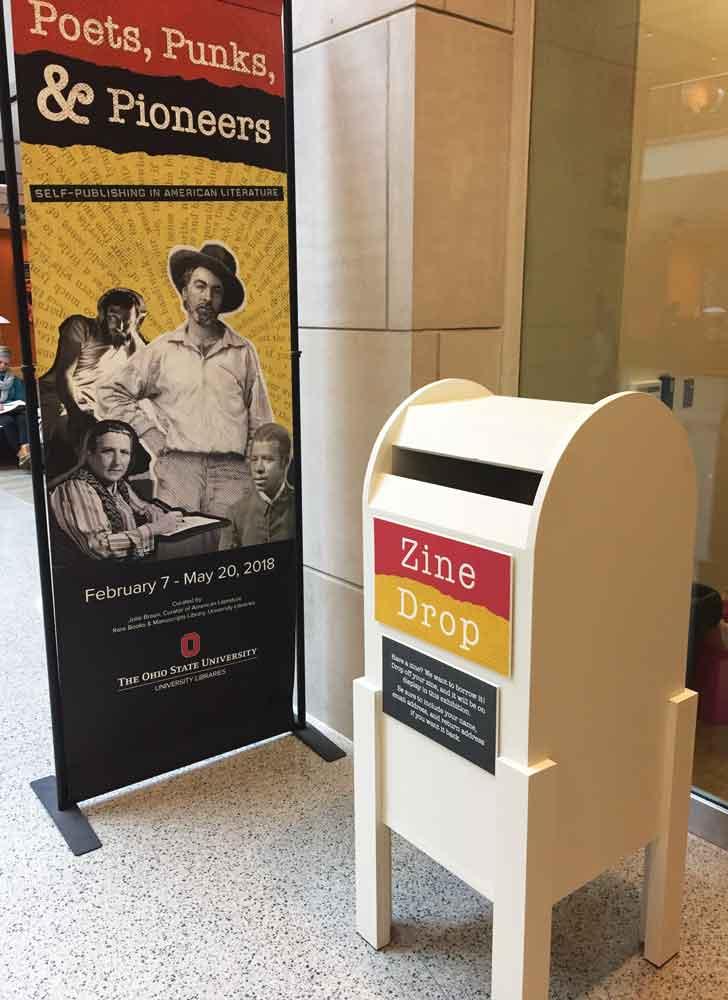 To coincide with a library exhibition on self-publishing, a zine drop box was installed, allowing anyone to share their zine, which would then be displayed in the exhibit, made available for visitors to read, and added to the library's zine collections.