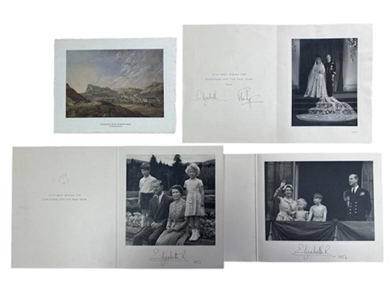Other highlights in the collection include some very rare Christmas cards send by the two Princesses in the 1940s. These are signed by both princesses and have the twin E and M monograms on the front cover of the cards. There are nearly 40 Christmas cards in the sale, dating from between the mid-1940s to the early 1990s. Some are signed by The Duke of Edinburgh as well as by Queen Elizabeth. The earlier cards usually had the royal ciphers on the front of the cards with a black and white photograph to the interior.