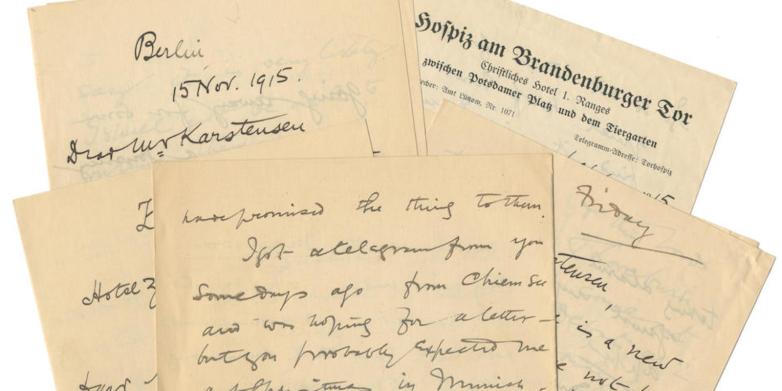 The letters were written between November 6, 1915 and March 6, 1916 during the latter part of Casement's stay in Germany (1914-1916). The recipient, Max Karstensen, was a political insider and an influential special correspondent for the Münchener Zeitung for which Casement occasionally provided articles. In 1921, Karstensen sent the letters to the British diplomat David Somerville with a long, detailed and revealing letter of his own giving his sympathetic observations on Casement and his fate. Kartensen's letter, which has also never been seen before, is included in the sale.